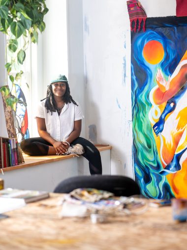 My work confronts the structure and function of the Self. I explore the nature of being as it relates to mythology, earth-based practices and Black women’s wisdom traditions. I combine conventional oil painting materials with non-traditional materials like fabric and glass to create tapestry paintings that personify energy, and speculate about the etheric body.